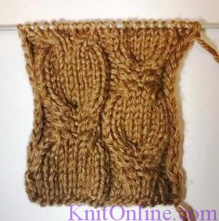 9 ряд: 2 изн., 8 лиц., 2 изн., 2 петли снять на дополнительную спицу и оставить за работой, провязать 2 лиц., затем провязать 2 петли лиц. с дополнительной спицы; 2 петли снять на дополнительную спицу и оставить перед работой, провязать 2 лиц, а затем провязать 2 петли лиц. с дополнительной спицы