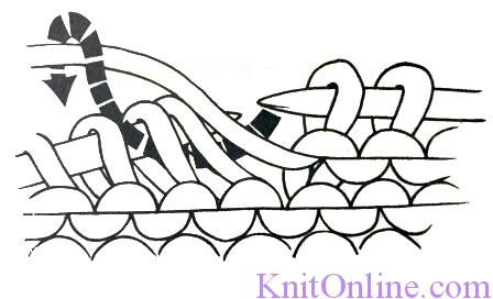 Нить перед работой. Правую спицу ввести сразу в три соседние петли на левой спице как при вязании изнаночной, все три петли провязать вместе изнаночной. Провязанные петли снять с левой спицы.