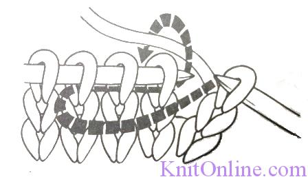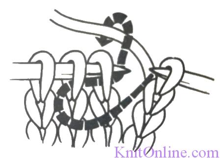 Нить за работой. Правую спицу ввести в петлю на левой спице как при вязании лицевой петли и снять ее непровязанной на правую спицу.
