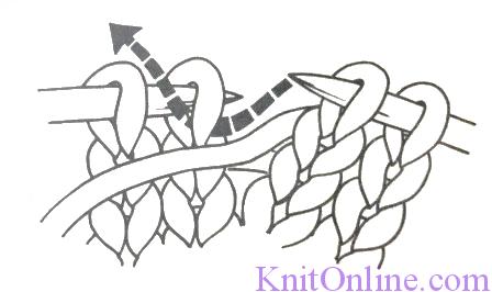 Нить перед работой. Правую спицу ввести за нитью в петлю на левой спице как при вязании изнаночной петли и снять ее непровязанной на правую спицу.