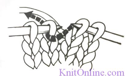Нить за работой. Правую спицу ввести в переднюю часть петли на левой спице и провязать лицевую петлю; провязанную петлю оставить на левой спице; правуюспицу ввести в заднюю половинку той же петли и провязать английскую лицеву; дважды провязанную петлю снять с левой спицы.